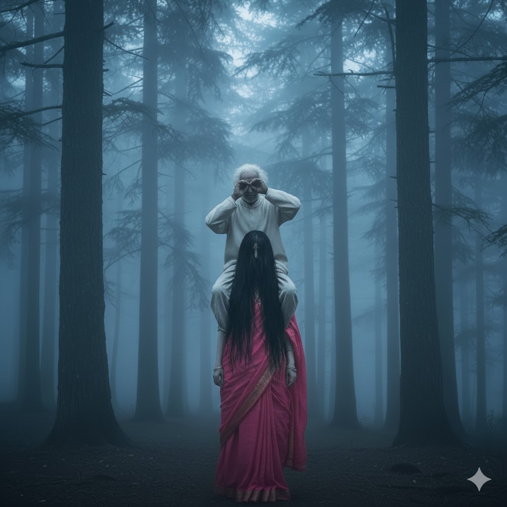 बोला कि बीच में थकान सी हुई तो मैंने सोचा घंटा भर नींद लगा लूं। वहीं लकड़ियों के चट्ठे के बीच तौलिया रखकर सो गया मै। नींद में ऐसा लगा कि कोई महिला मुझे आवाज दे रही है। नींद खुली और उठकर आसपास देखा। फिर आवाज आई तो कम से कम 100 मीटर दूर पेड़ों के बीच एक महिला दिखाई दी। उससे भी अजीब बात ये कि उसके कंधों पर एक बूढ़ा बैठा हुआ था, जो दूरबीन से मेरी तरफ देख रहा था। बड़ा अजीब सीन था यार। मैं उनकी तरफ करीब एक मिनट देखकर समझने की कोशिश करता रहा कि है क्या मामला। डर के मारे मेरी आत्मा कांप रही थी। न वो मेरी तरफ आ रहे थे, न जा रहे थे। मैं तो अपनी जगह फंस ही गया था। इतने में उस बूढ़े ने जब दूरबीन हटाई तो मुझे उसका चेहरा दिखाई दिया। और भाई चेहरा देखा तो मैं बेहोश हो गया। मेरा दादू बैठा हुआ था उस औरत के कंधों पर वो भी अपने उन कपड़ों में, जो उसने इधर-उधर जने को रखे हैं। इसके बाद वो महिला मुड़ी और दादू समेत जंगल में चली गई। तबसे भागकर मैं यहीं जंगल से बाहर बैठा हुआ हूं।